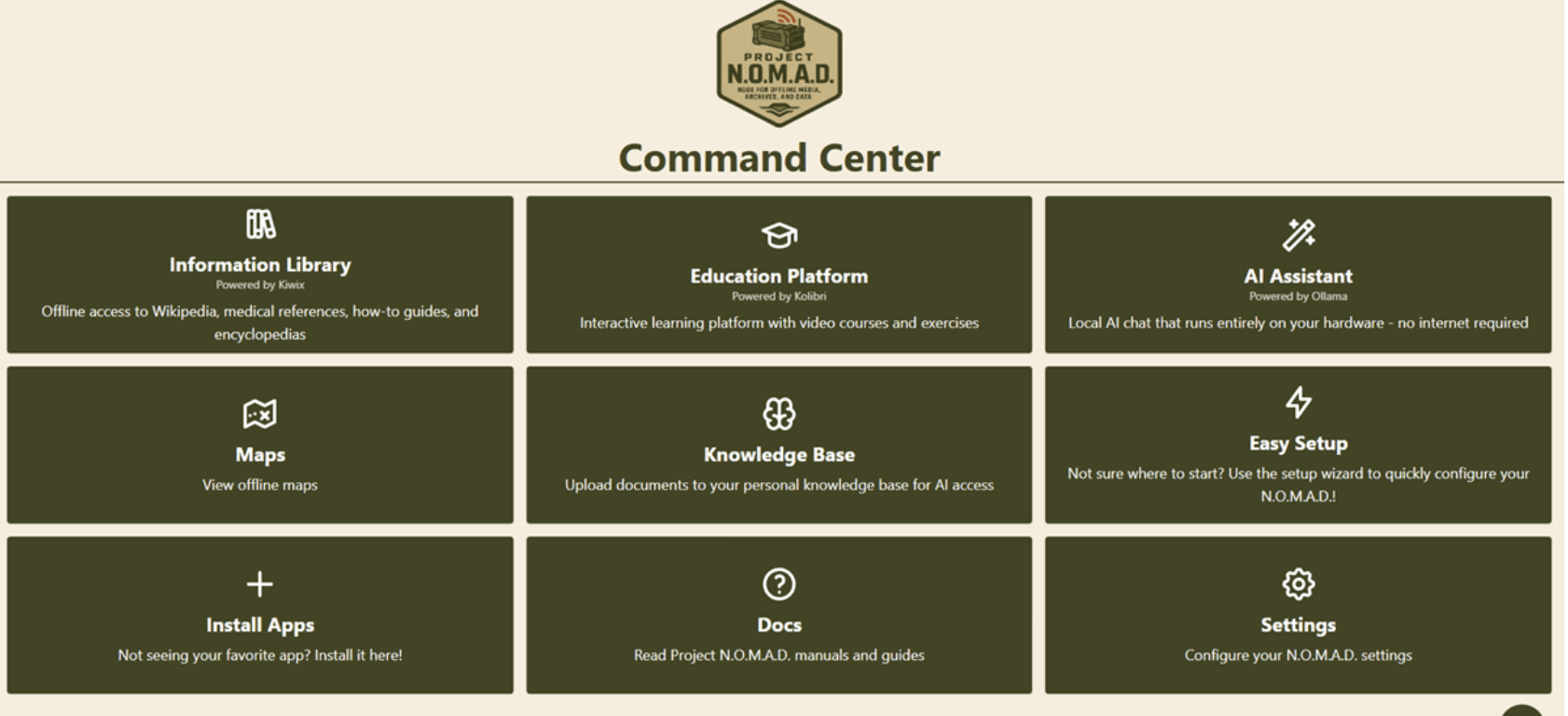 Part philosophy, part tooling and centred around preserving access to information regardless of connectivity, Project NOMAD’s aim is in the name: Node for Offline Media, Archives and Data.