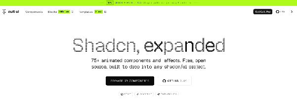 Cult UI builds on the popular shadcn/ui ecosystem with a curated collection of animated components, blocks and templates designed to drop into React and Next.js projects.