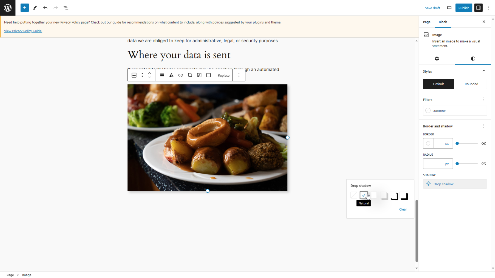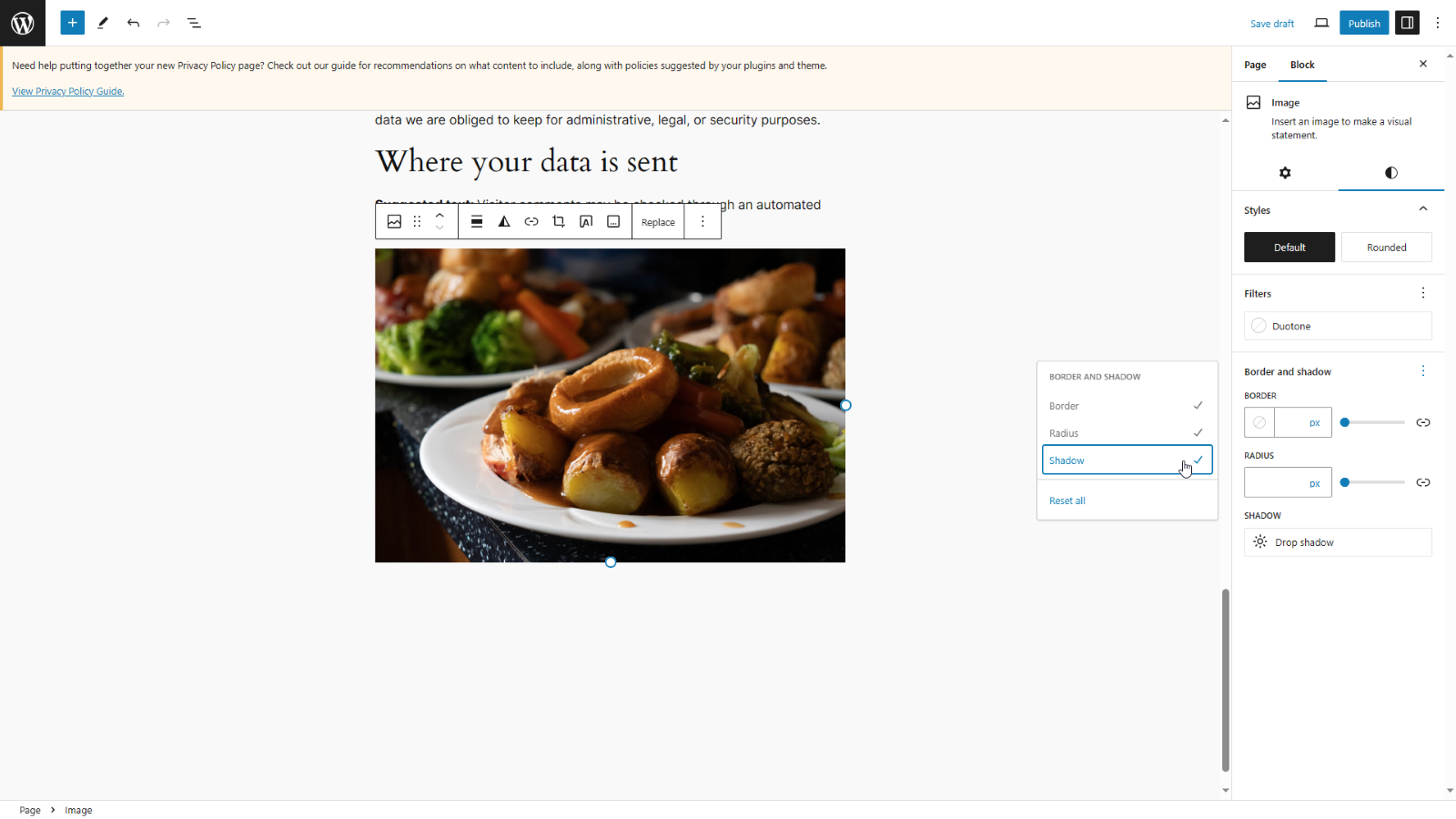 With WordPress 6.5 you add your content to a page or post and navigate to the Styles submenu and click on the three dots within the Border and shadow section.