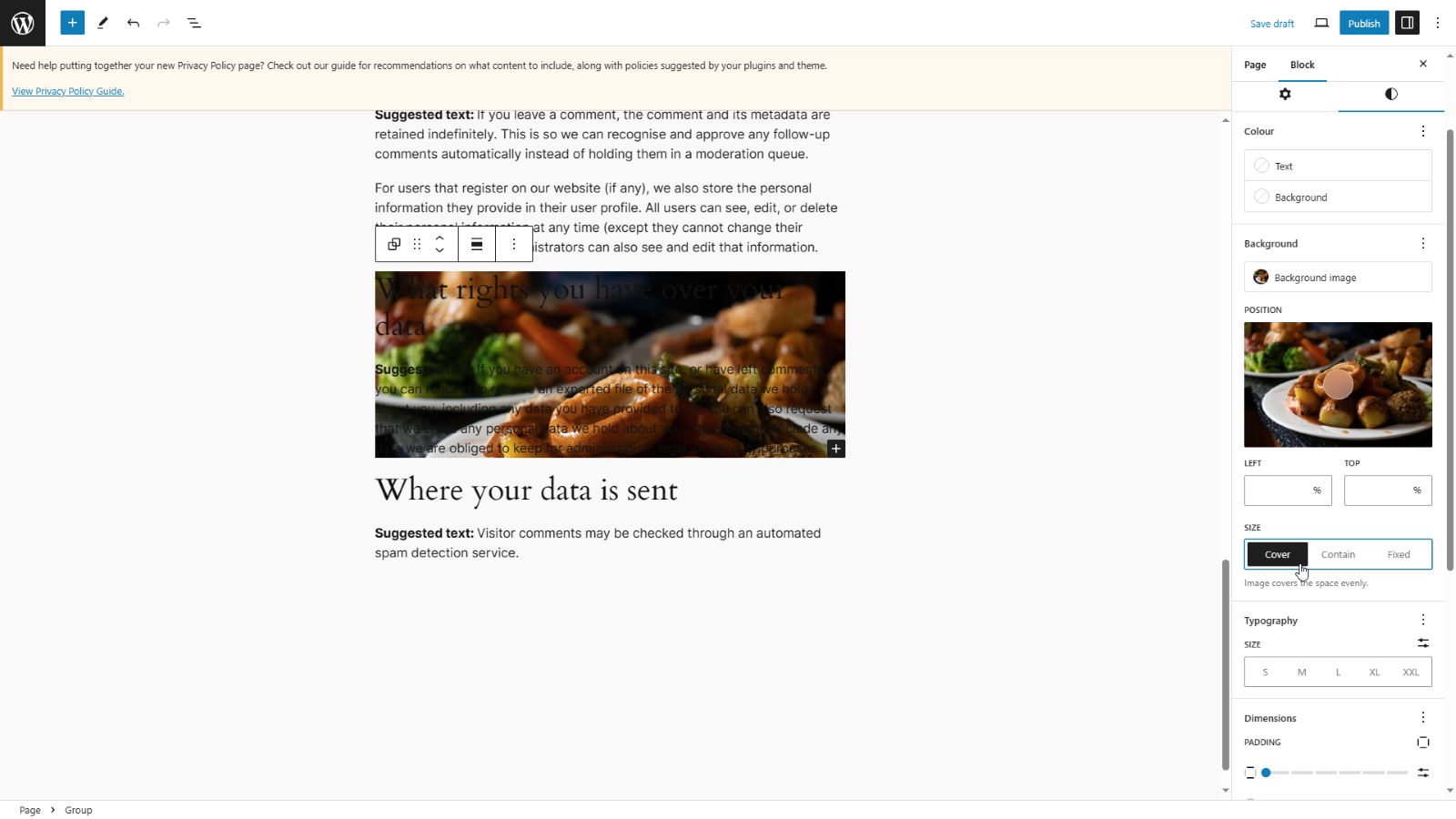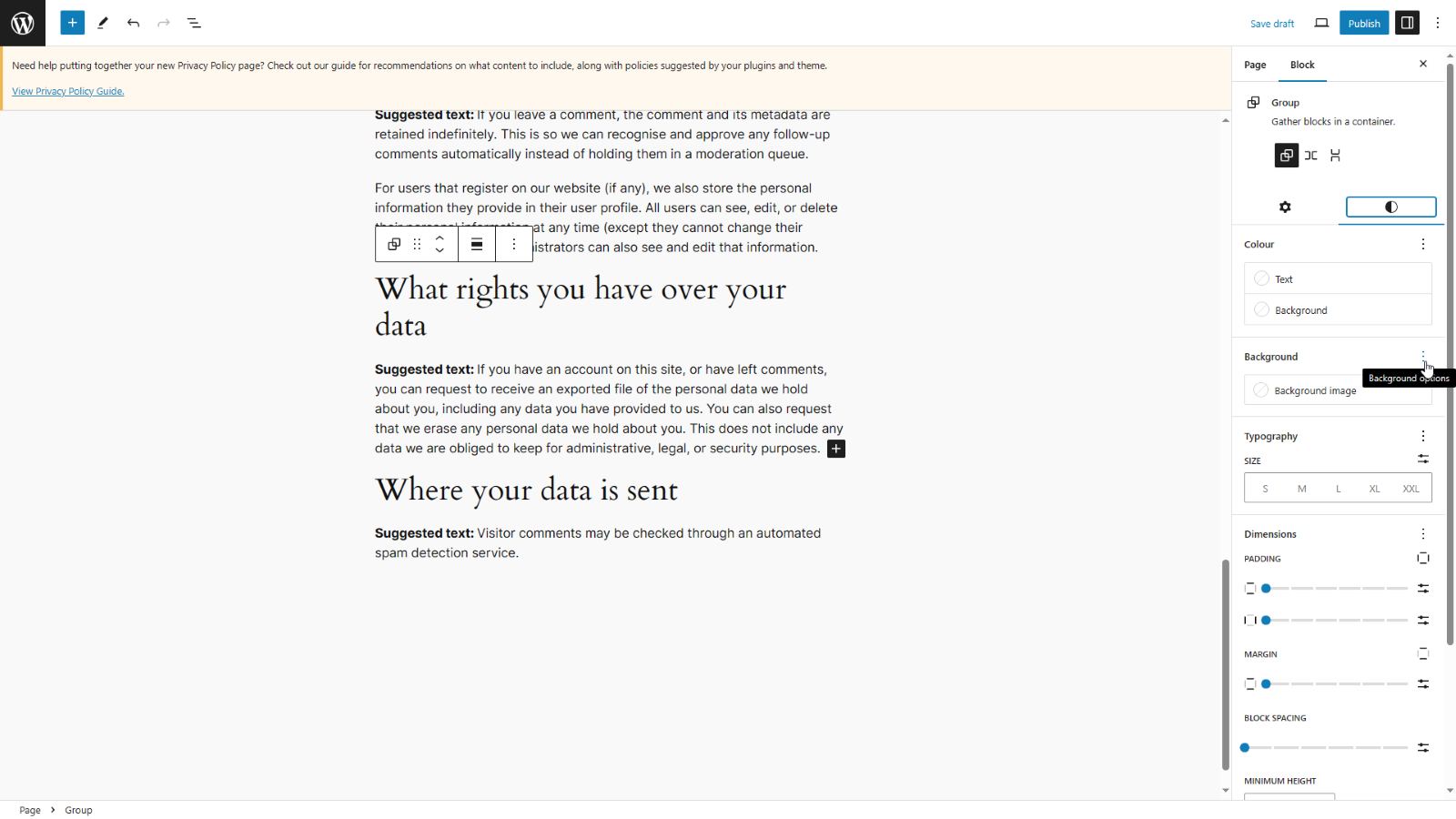 Once you have selected a block, go to add a background image as normal and click the three dots next to the Background heading.